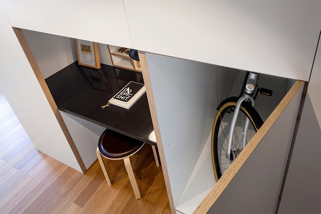 Ý tưởng của các kiến trúc sư là tích hợp nội thất thông minh trong một không gian nhỏ. Cầu thang dẫn lên gác xép có thể xếp gọn vào tủ, bàn làm việc dưới giường…